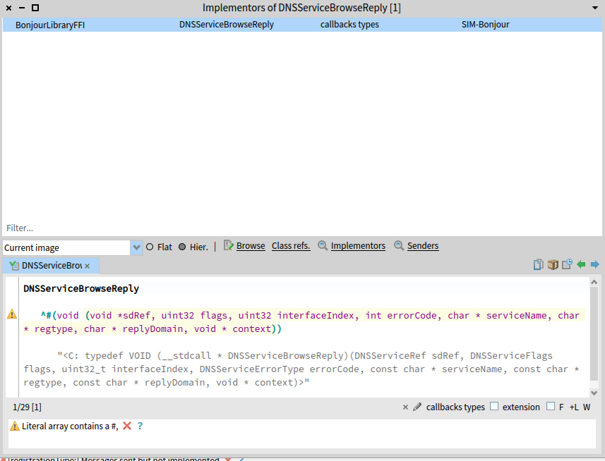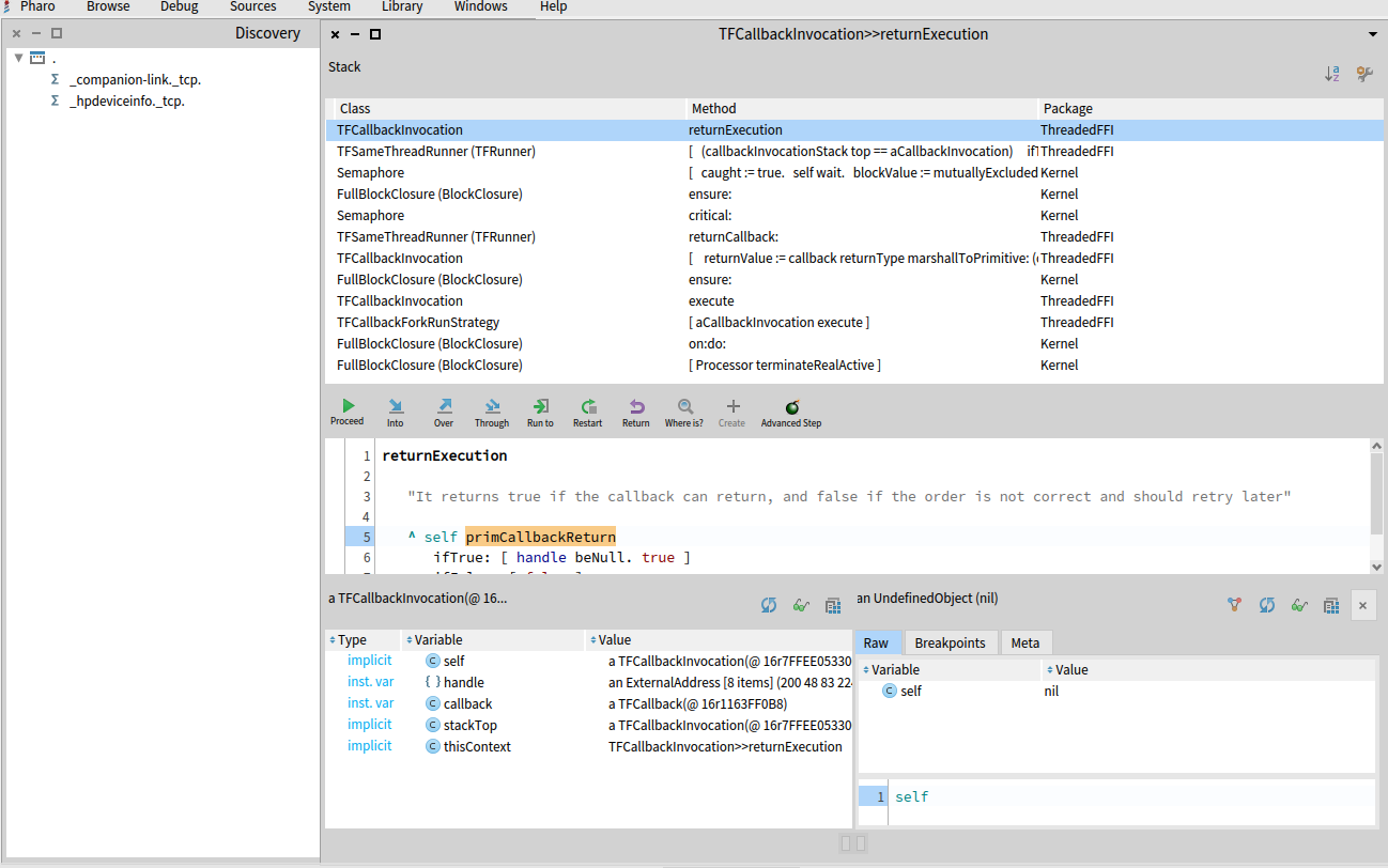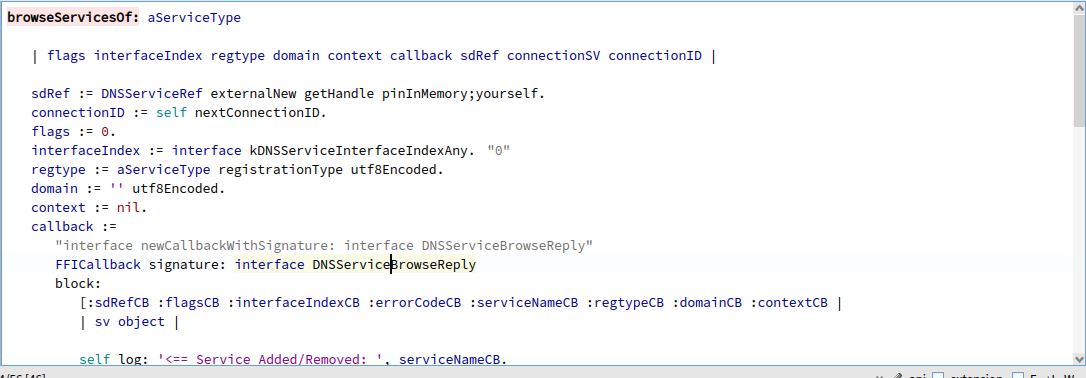 > Ok, after bashing my head against the Spinning Wheel of Death for ages trying to use FFI to interface to the Bonjour service discovery library, I've done it another way using essentially the same design framework, but scraping the command line output from dns-sd with the help of OSSubProcess. This is on a MacOS/M1/Monterey, Pharo 10 setup.