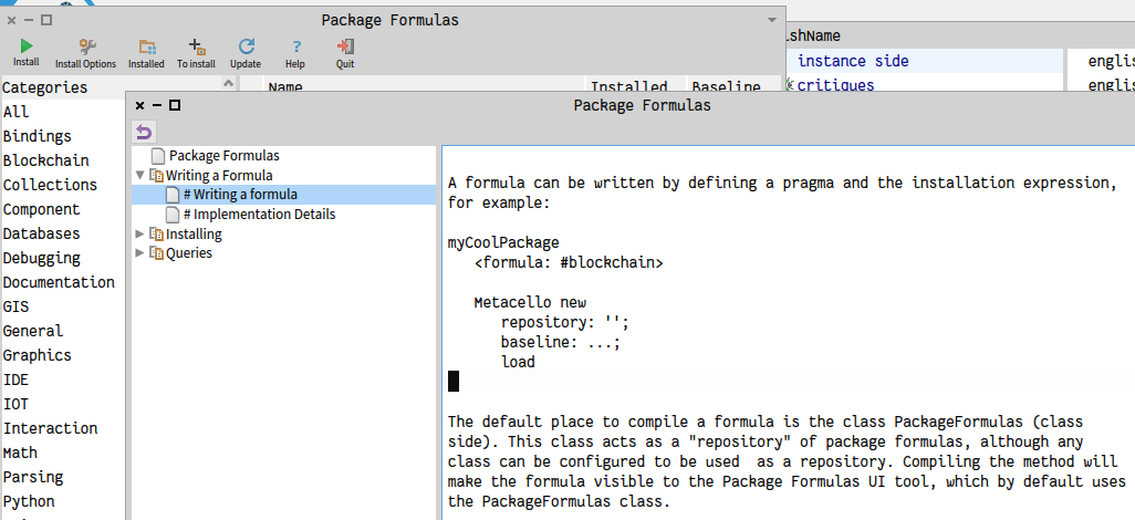 I have spent some time creating a new package manager UI for Pharo 10 to simplify package finding and installation. It is a Spec application which introduces a new concept: Package Formulas. These are just annotated methods with an installation expression, so they do not depend on Metacello, Gofer, Pakbot or any other package manager.