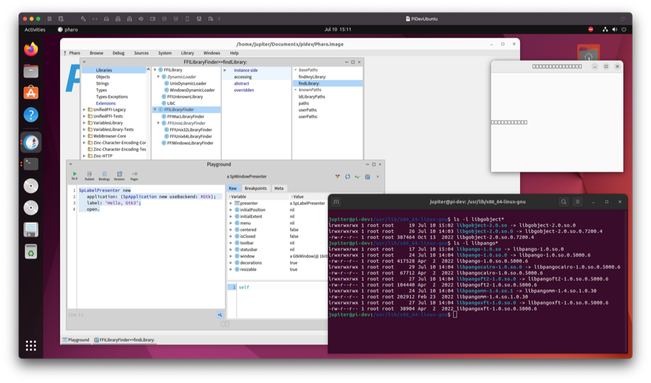 > > > I created a new ubuntu 22 install, installed pharo 11 and installed spec-gtk. The first issue was the libraries are named: libgobject-2.0.so.0 and libpango-1.0.so.0 with the “.0” suffix. I created links to those with the names spec-gtk is expecting.