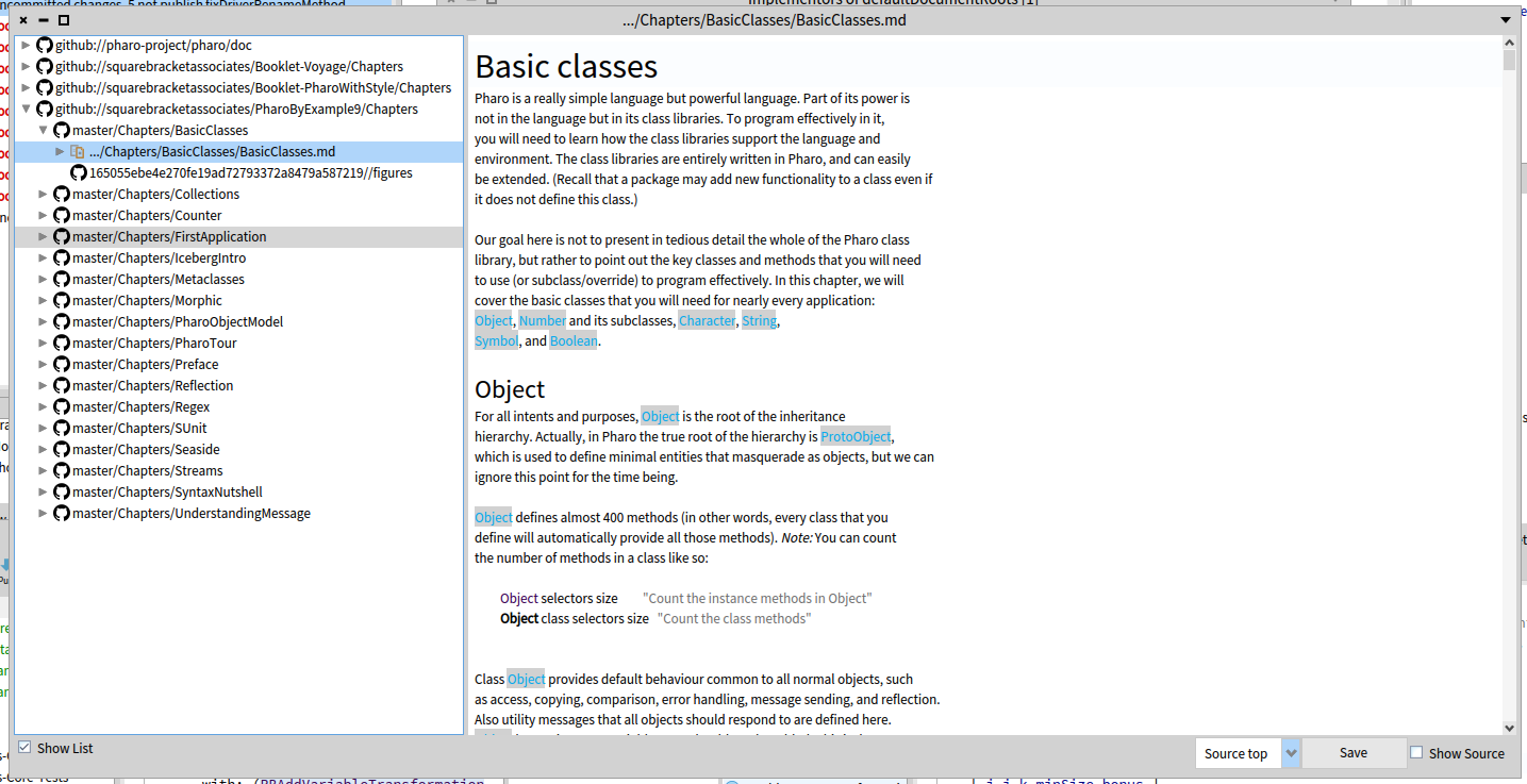 documentation inside Pharo, which was obtained in a pretty primitive