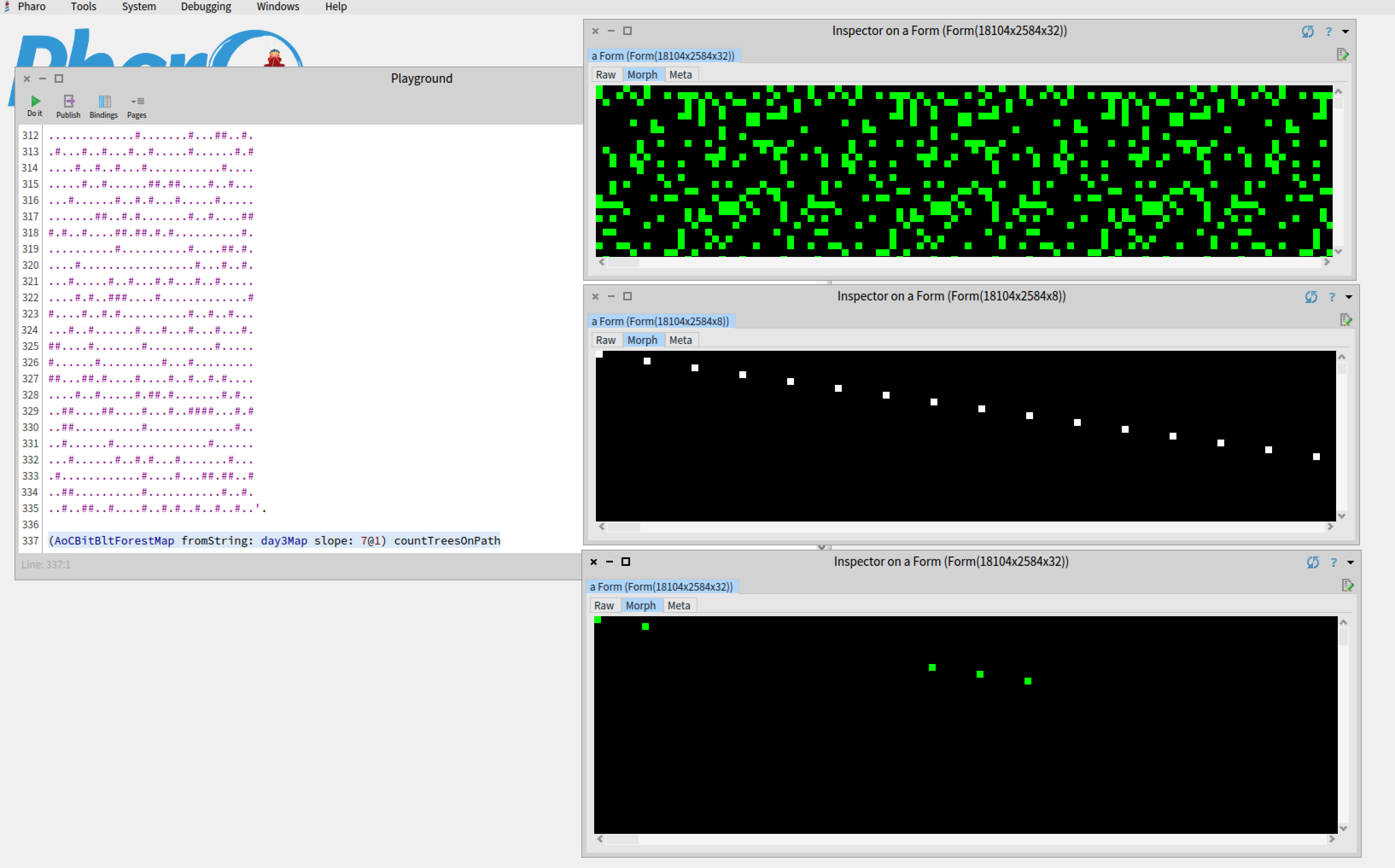 After implementing the straight-forward and iterative solution, I tried using Form instances representing the map and the slope and a BitBlt operation for ANDing both forms in order to leave only bits where you encounter a tree (see attached image). In this alternative solution I like how the iteration is replaced by only one "BitBlt>>copyBits" operation. Additionally, I understand that BitBlt operations are native primitives that could be hardware optimized.